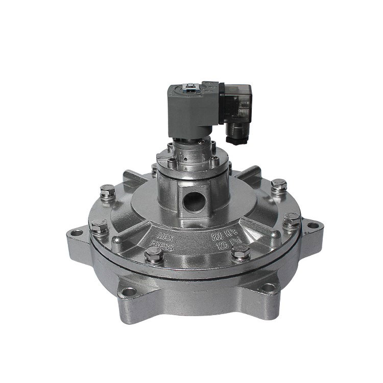 Неговата характеристика е, че входящите и изходящите тръби за въздух на правоъгълния вентил са под ъгъл от 90°. Корпусът на клапана и капакът са отляти под налягане с помощта на материал от алуминиева сплав. След повърхностна обработка те показват отлична устойчивост на корозия. Диафрагмата и уплътнителното уплътнение се произвеждат чрез вулканизиран композитен процес. Суровините за електромагнитната пилотна глава се състоят от високоефективни магнитни материали и материали за магнитно екраниране от неръждаема стомана. Критични компоненти като пружини и крепежни елементи са изработени от неръждаема стомана. Метод на свързване: Тръбата на разпределителя на въздуха (въздушния резервоар) и вентилационната тръба на прахоуловителя се вкарват съответно във входа и изхода на клапана, запечатани с компресионни гайки в двата края.